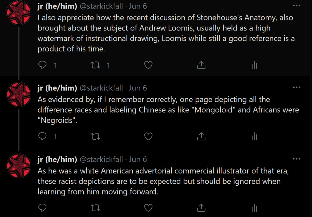 One of the current viral issues in the artist/illustrator community is the issue of the instructional drawing book Stonehouse’s Anatomy by Korean artist Seok Jung Hyun, it was full of pseudoscience in connection to instructional how-to draw art, the usual white people’s eyes are huge so more direct communication and Asian people’s eyes are small so more indirect communication, pseudoscience stuff like that. If I can get a hold of an English copy without dumping US$80+ on it, I can go through every bad example in it but that’s another thing entirely.